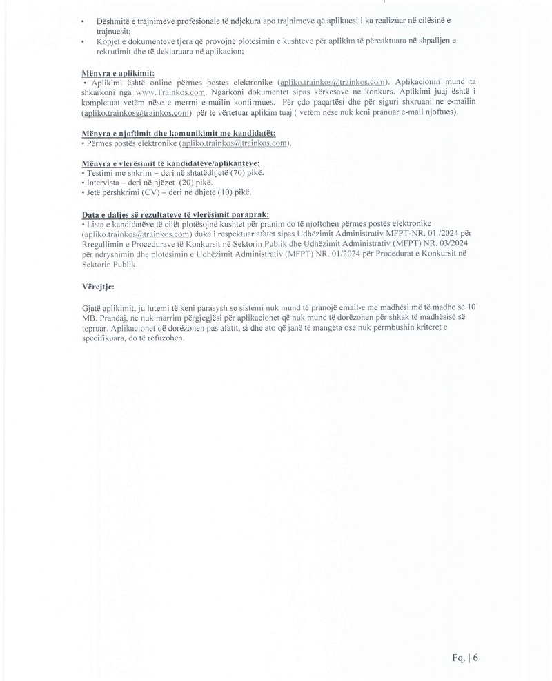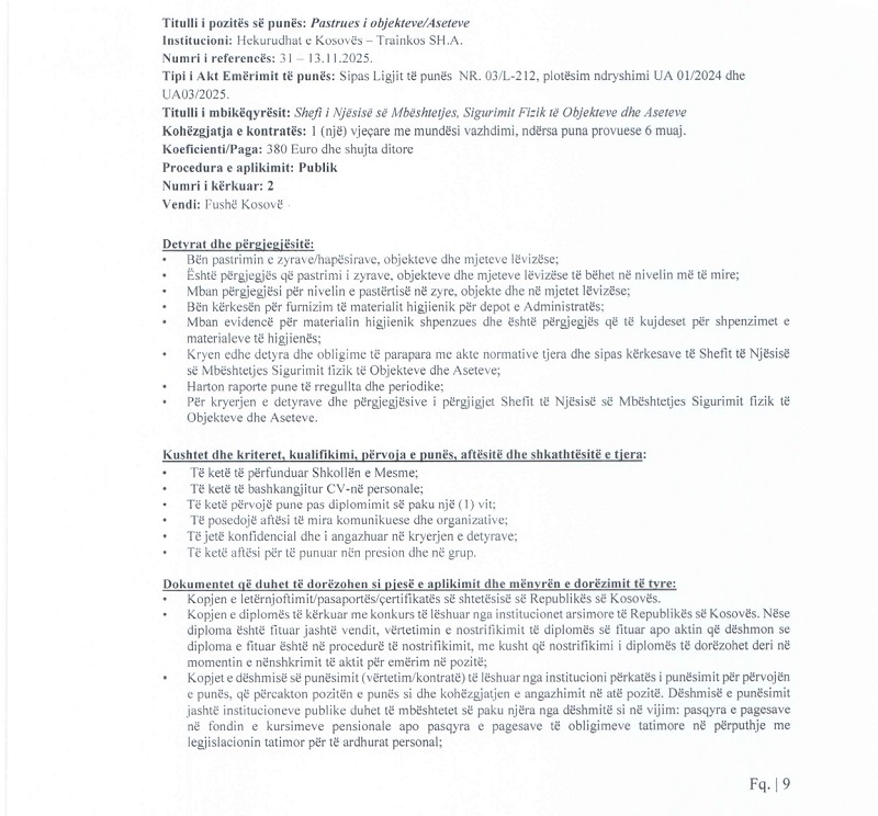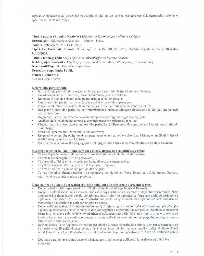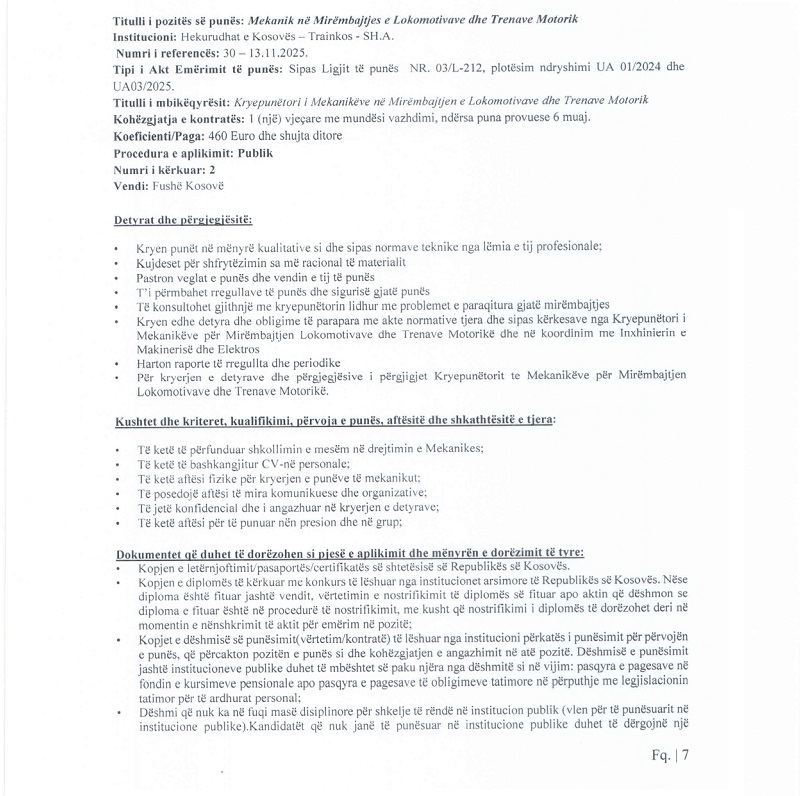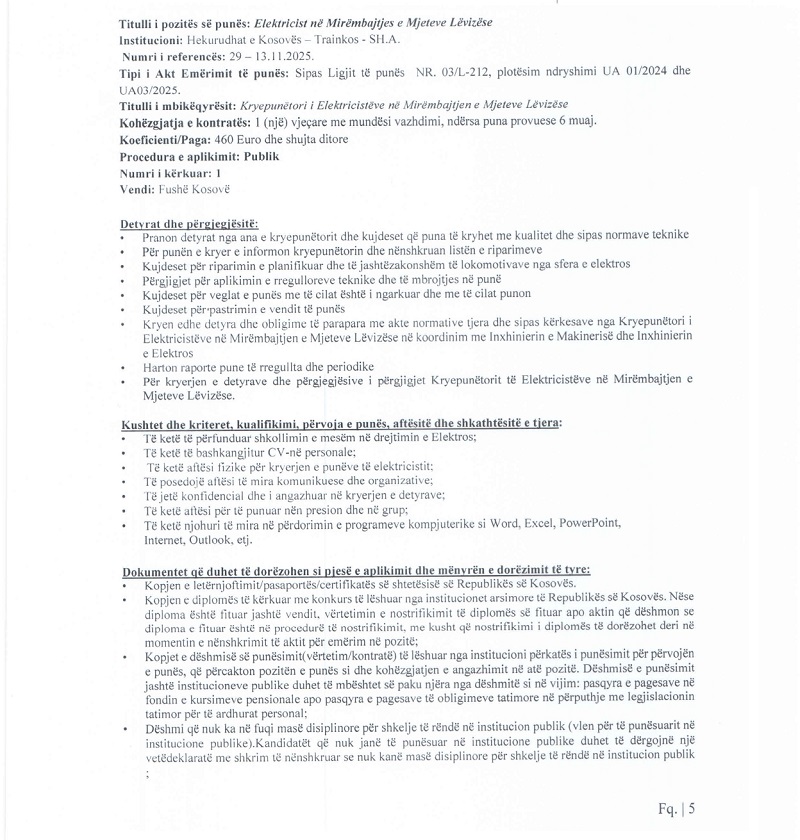 Menaxher (1), Inxhinier i Elektros (1), Elektricist (1), Mekanik (2), Pastrues (2)