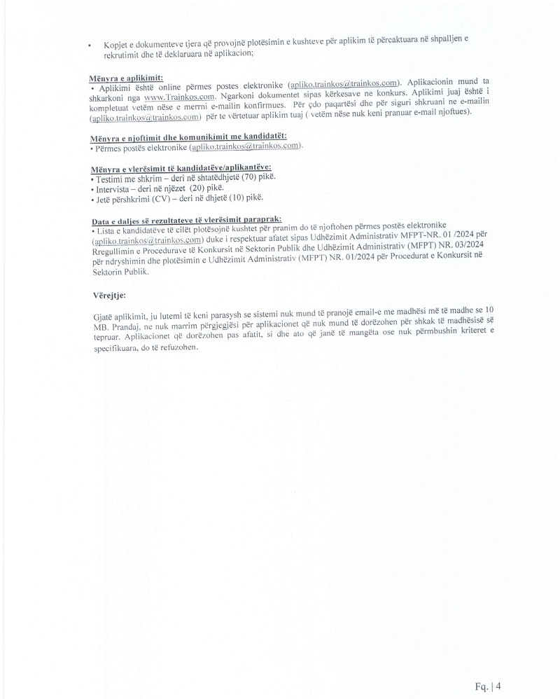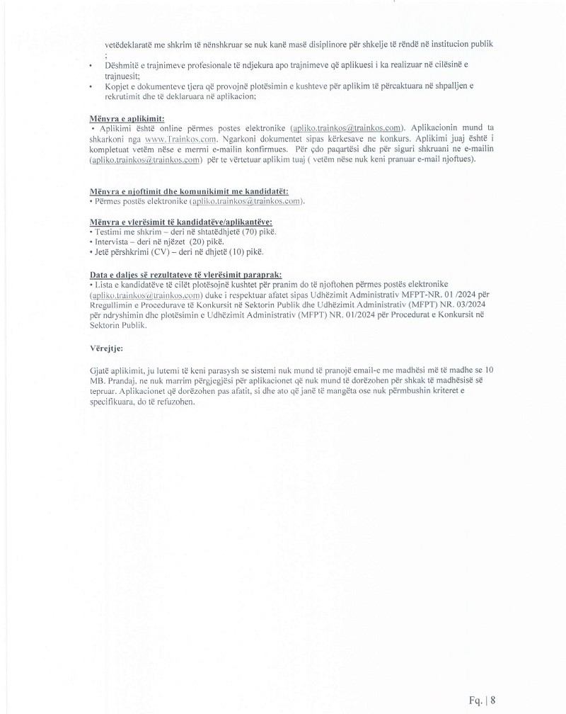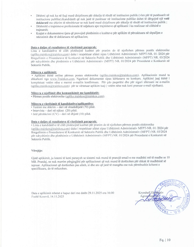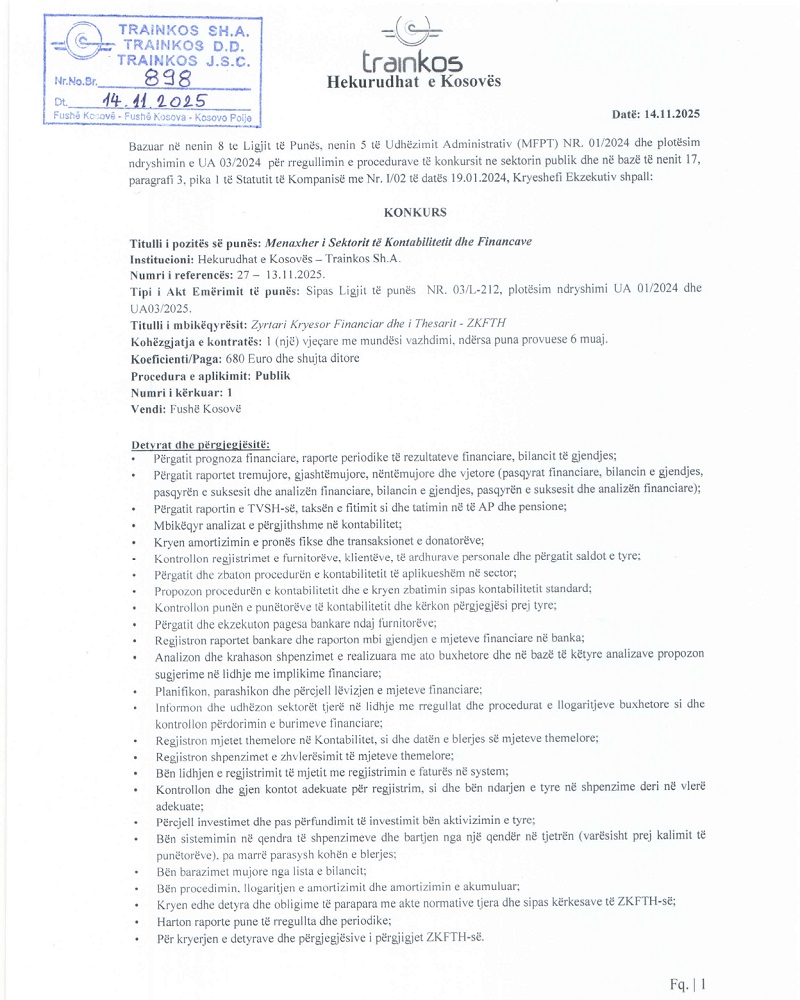 Menaxher (1), Inxhinier i Elektros (1), Elektricist (1), Mekanik (2), Pastrues (2)