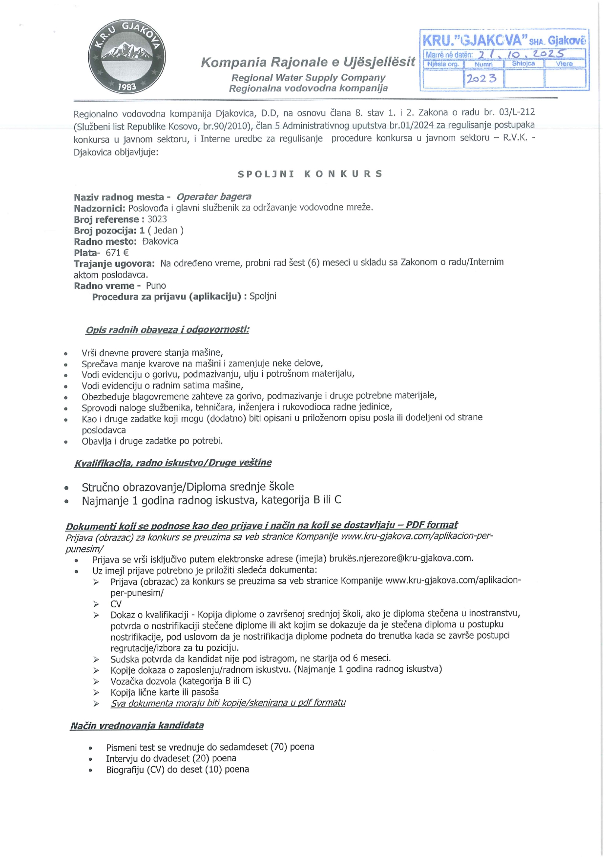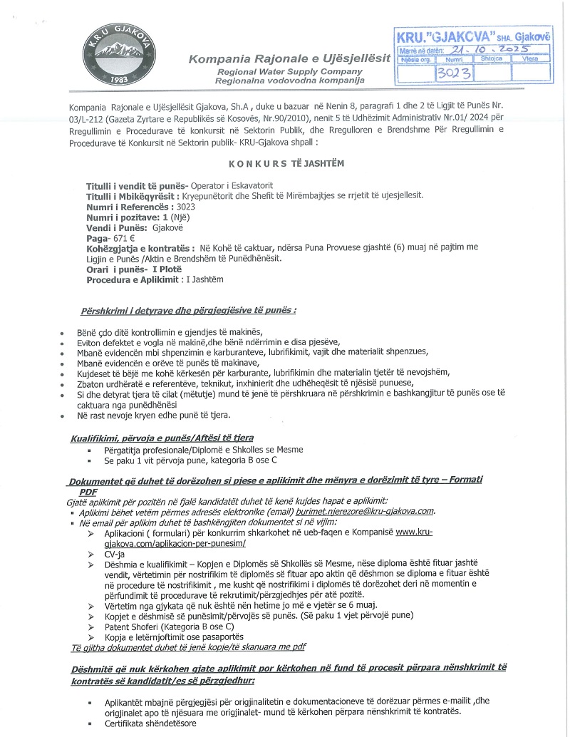 Inxhinier/e për Projektim dhe Menaxhim i Projekteve, Punëtor fizik, Operator i eskavatorit