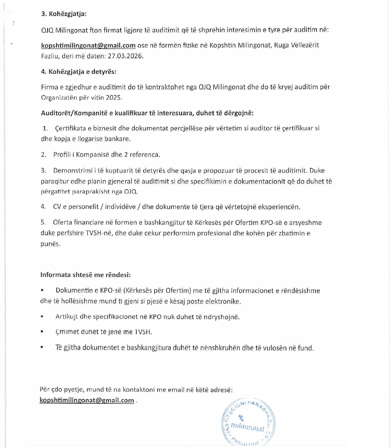 Thirrje e Hapur për Shërbime të Auditimit