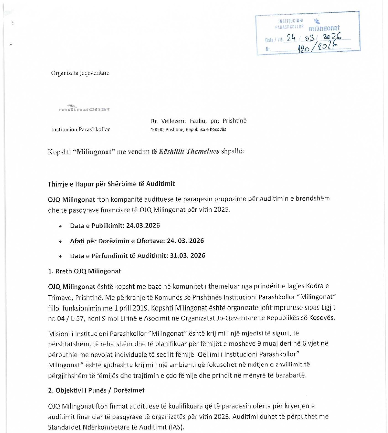 Thirrje e Hapur për Shërbime të Audit...