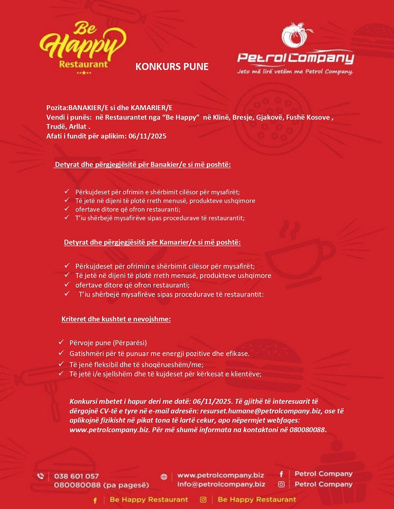 Kamarier/e, Ndihmës kuzhinier/e,...