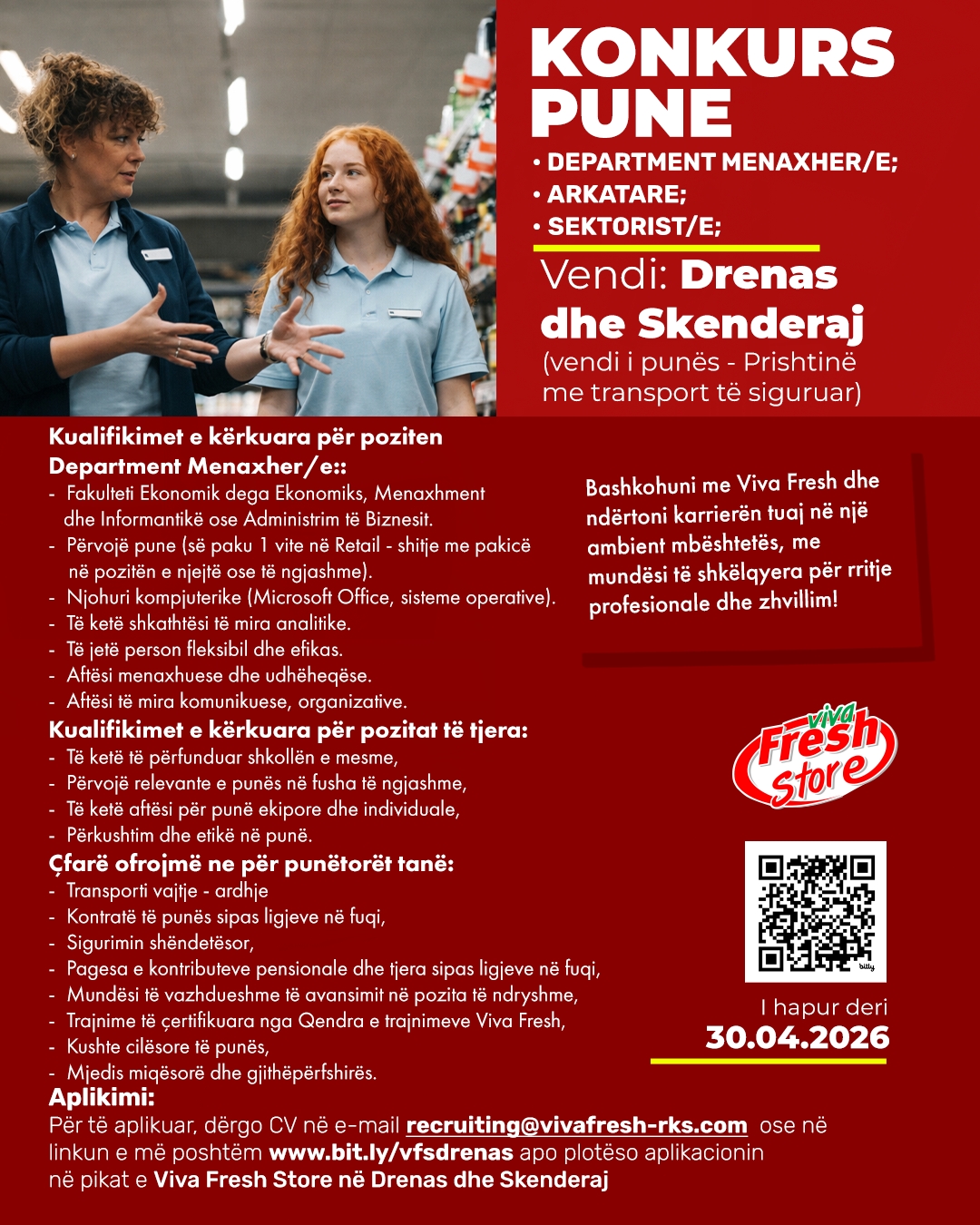 Linku per aplikim: https://vivafresh-rks.com/aplikimet/apliko-per-pune-ne-drenas/
