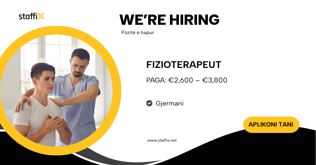 staffiX është kompani e specializuar në fushën e rekrutimit dhe përzgjedhjes së stafit. Për nevojat e klientit tonë, i cili operon në sektorin shëndetësor në Gjermani, jemi në kërkim të kandidatëve të motivuar për pozitën Fizioterapeut. Kandidati ose kandidatja do të ketë një rol të rëndësishëm në ofrimin e shërbimeve shëndetësore cilësore, kujdesin ndaj pacientëve dhe bashkëpunimin me ekipin mjekësor, duke kontribuar drejtpërdrejt në ruajtjen e standardeve dhe funksionimin e institucionit shëndetësor.