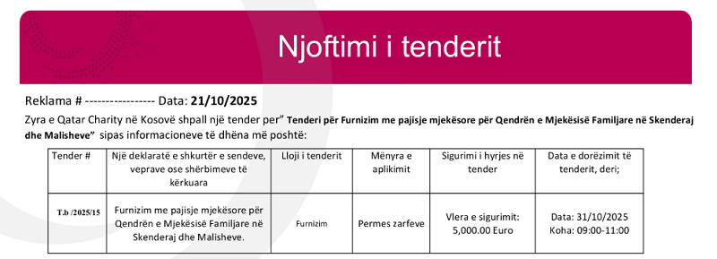 Njoftim i tenderit: Furnizim me pajisje mjekësore për Qendrën e Mjekësisë Familjare në Skenderaj dhe Malishevë