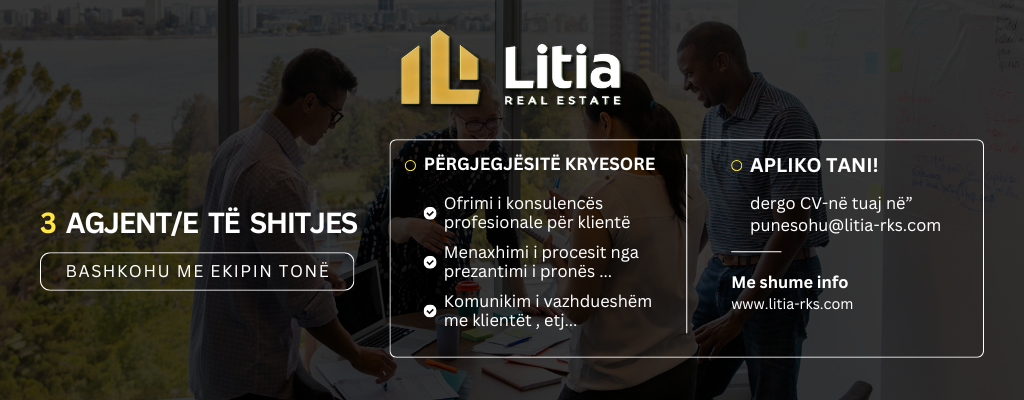 Litia Real Estate shpall konkurs pune për Agjent/e të Shitjes (shitje & qira) për Prishtinë dhe rrethinë.