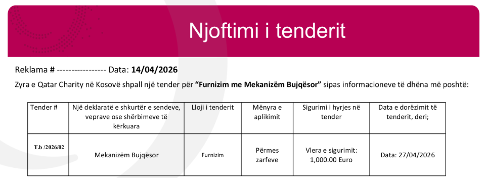 Dokumentet e tenderit mund të merren nëpërmjet postës elektronike [email protected] , ndërsa dorëzimi bëhet përmes zarfeve në adresën: Rr Avdyl Frashëri nr. 39 Prishtinë-Kosovë.