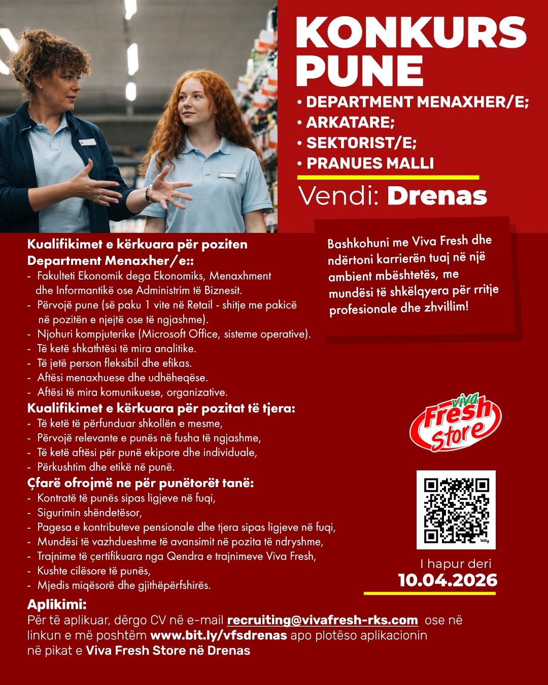 Linku per aplikim: https://vivafresh-rks.com/aplikimet/apliko-per-pune-ne-drenas/